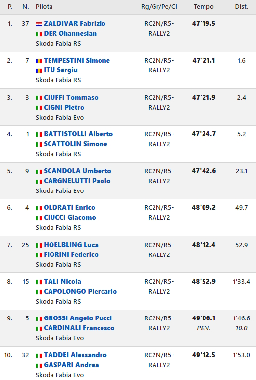 A chiudere le prime dieci posizioni ci hanno poi pensato Angelo Pucci Grossi, nono a 1:46.6, in crescita di feeling durante la gara e navigato da Francesco Cardinali, ed Alessandro Taddei con Andrea Gaspari decimi assoluti a 1:53.0.