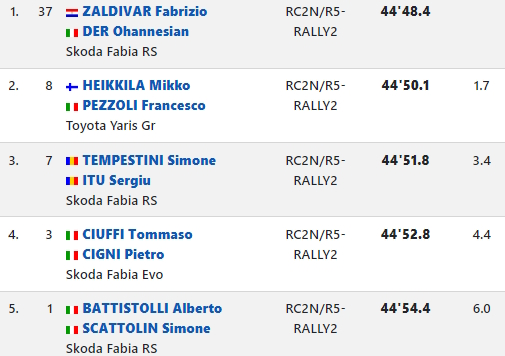 Una gara straordinaria, una lotta sul filo dei secondi terminata proprio in vista del traguardo e che ha visto protagonisti, per tutta la gara, dall’inizio alla fine, cinque equipaggi: il paraguayano Fabrizio Zaldivar, il finlandese Mikko Heikkila, Simone Tempestini, qui in gara con licenza rumena, e gli “italianissimi” Tommaso Ciuffi e Alberto Battistolli. Si sono presentati al via dell’ultima prova speciale racchiusi in appena 6 secondi, dopo due giornate di gara, nove prove speciali, e 75 chilometri cronometrati.