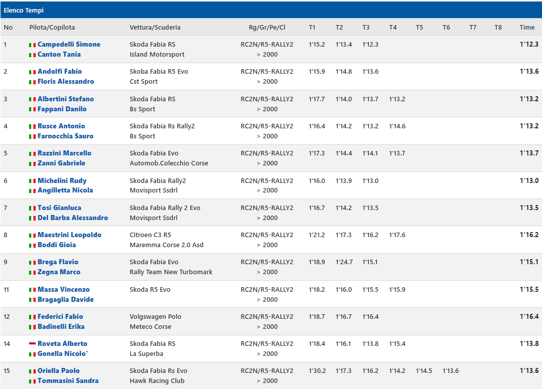 Subito dietro al pilota romagnolo Edoardo De Antoni, affiancato da Martina Musiari sulla Skoda Fabia Evo, poi Rudy Michelini, insieme a Nicola Angilletta, autore del terzo tempo sulla Skoda Fabia Rally2 di MM Motorsport.
