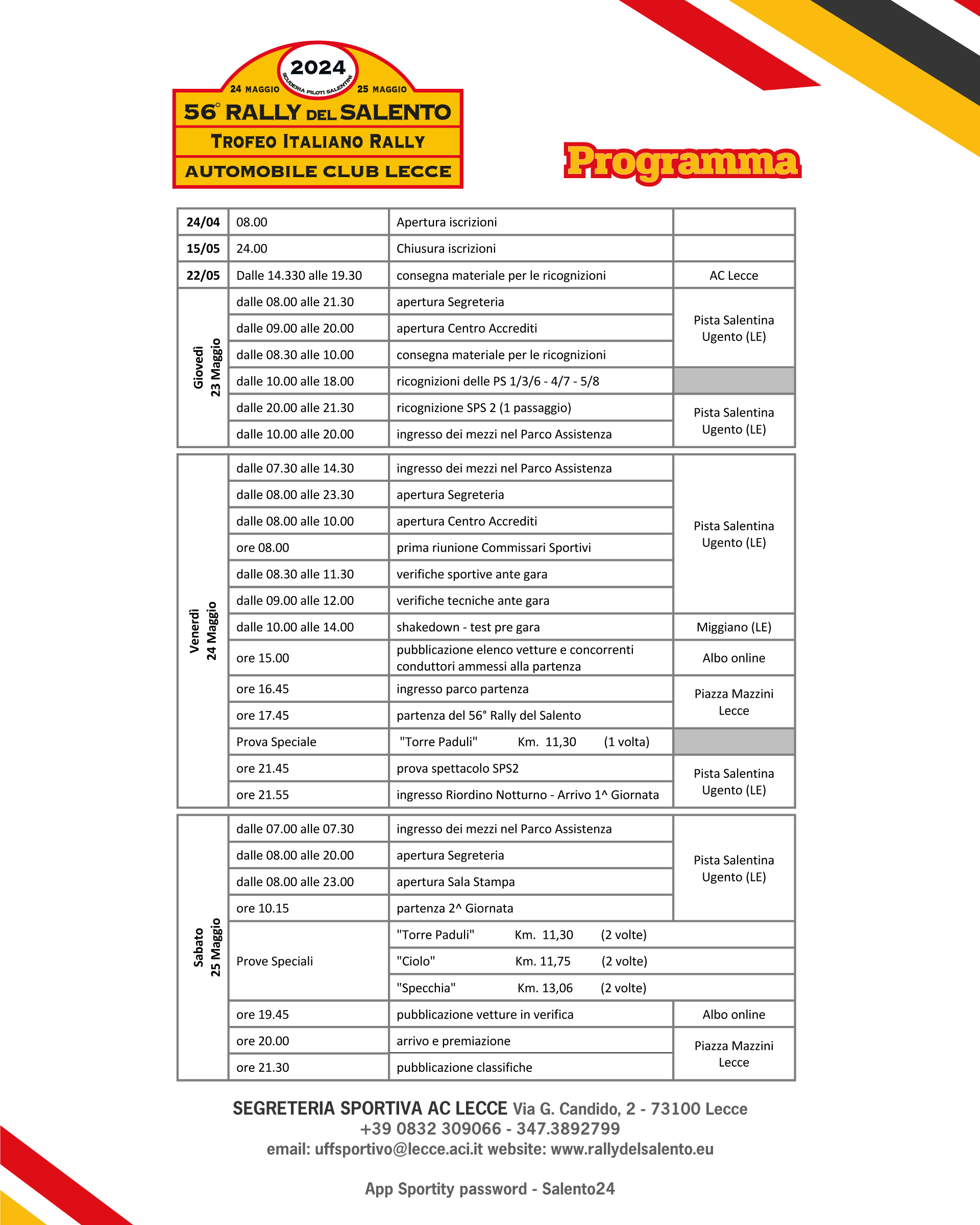 Ci sarà tempo fino al 15 maggio per perfezionare le iscrizioni alla 56esima edizione del Rally del Salento. Due giornate di sfide col cronometro, lungo i 429,07 chilometri del tracciato, dei quali 86,16 di prove speciali. Questo il mix fondamentale dell’edizione venti-ventiquattro della manifestazione salentina, pronta, ancora una volta, a stupire partecipanti e appassionati. Il terzo atto del neonato Trofeo Italiano Rally andrà in scena lungo le strade del Tacco d’Italia il 24 e 25 maggio prossimi e sarà organizzato, come consuetudine, dallo staff dell’Automobile Club di Lecce, presieduto da Francesco Sticchi Damiani.