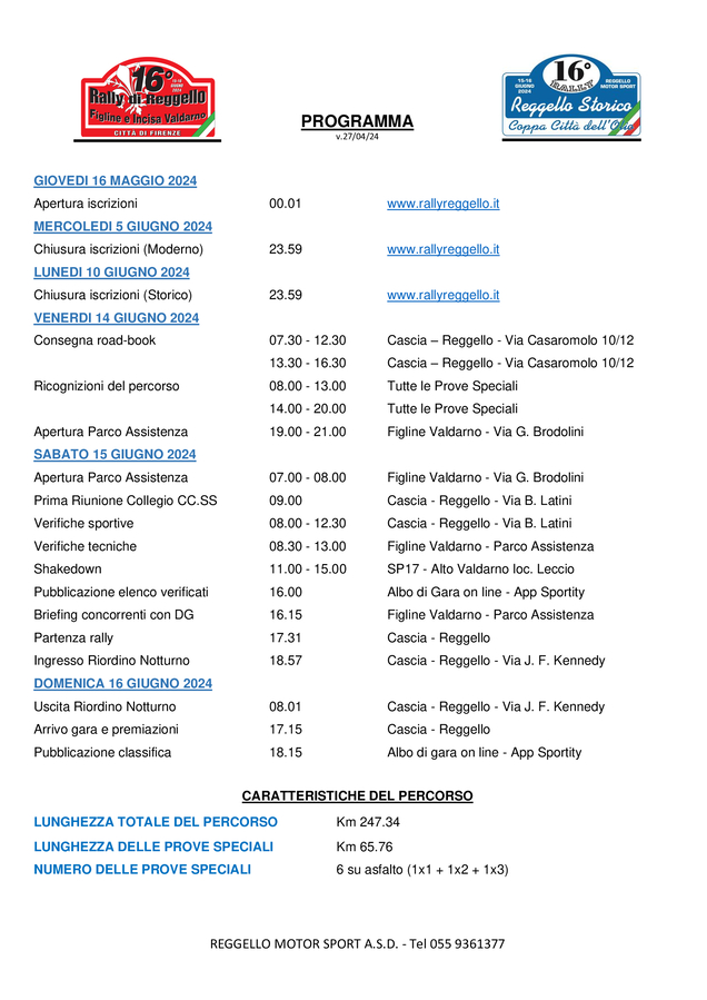 Reggello Motor Sport ha definito programma e percorso della 16° edizione del Rally di Reggello-Figline e Incisa Valdarno, previsto per il 15 e 16 giugno, quarto atto della Coppa Rally di Zona 7, valido anche per il Trofeo Rally Toscano, il Trofeo Automobile Club Lucca, l’R-Italian Trophy ed il Michelin Trofeo Italia.