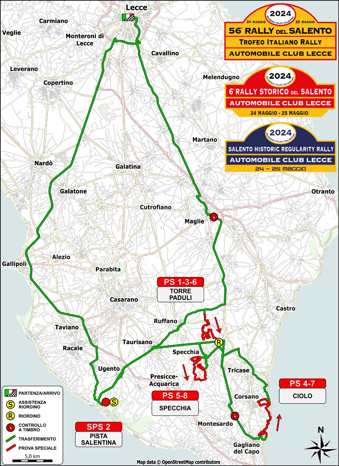 Luoghi e scorci paesaggistici unici accompagneranno i protagonisti che dovranno misurarsi con i 429,07 chilometri del tracciato, dei quali 86,16 di prove speciali, lungo un percorso che presenta alcune novità rispetto allo scorso anno. Due saranno le giornate di sfide col cronometro. Il primo giorno sarà la prova di Torre Paduli, di 11,3 chilometri, a recitare il ruolo d’apertura. Le attenzioni degli appassionati saranno tutte rivolte alla Super Prova Speciale della Pista Salentina, lunga 2,64 chilometri, che andrà in diretta televisiva. Il kartodromo ospiterà anche la direzione gara, i riordini e il parco assistenza. Tre i tratti cronometrati, che verranno ripetuti due volte e animeranno le sfide il secondo giorno. Si ricomincerà nuovamente dalla Torre Paduli che precederà la Ciolo, di 11,75 chilometri, che ritornerà a fare selezione dopo un anno di assenza e, infine, la difficile e insidiosa Specchia, la prova più lunga, di 13,06 chilometri, che spesso è stata determinate per la vittoria finale.