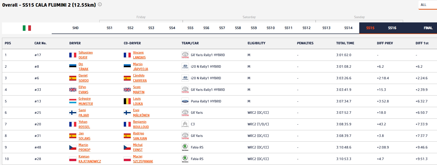 E sulla speciale successiva, la ripetizione di “Cala Flumini”, penultima speciale della gara prima della Power Stage, arriva l’attacco di Ott Tänak. L’estone vince la prova, rosicchiando altri 4 decimi ad Ogier, secondo in questa prova, e 2.3 secondi ad Evans. Ora il distacco tra i due contendenti alla vittoria finale, Ogier e Tänak, è di 6.2 secondi.