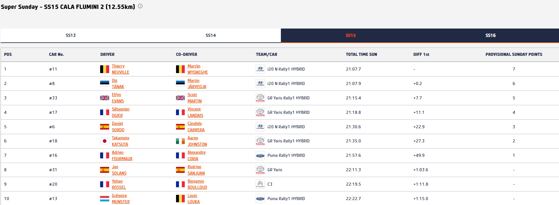 Neuville, attuale leader del Campionato, dopo essersi dovuto fermare nella giornata di sabato per un’uscita di strada, e non aver di conseguenza potuto raccogliere nemmeno un punto, è subito partito a tutta nella giornata di domenica, con un solo, grande obiettivo: guidare a fondo e guadagnare più punti possibili tra Super Sunday e Power Stage. Potrebbe ottenere un massimo di 12 punti, limitando, per quanto possibile, i danni derivanti dal suo ritiro di ieri.