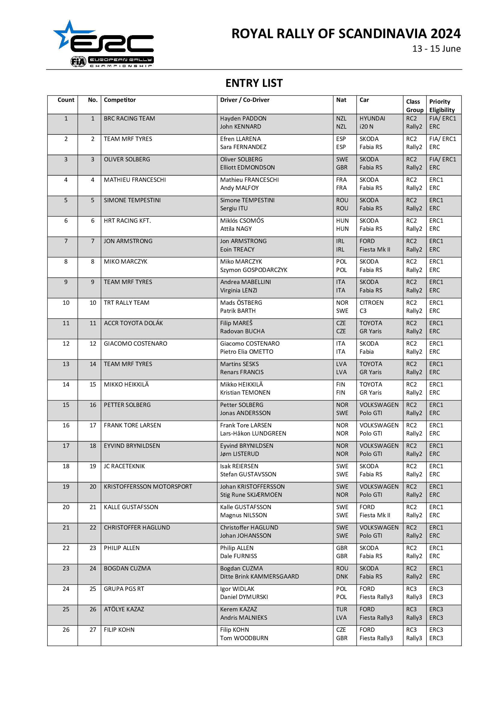 Igor Widłak prenderà il via per la prima volta al Royal Rally of Scandinavia con l’obiettivo di difendere la sua leadership nel campionato FIA ERC3, con Filip Kohn che punta a vincere consecutivamente l’ERC Fiesta Rally3 Trophy e l’ex pilota Tristan Charpentier, esperto in pista, che si prepara al suo debutto nell’ERC.