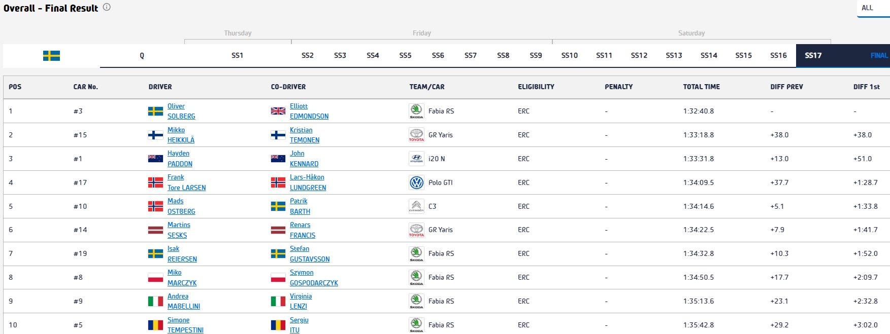 Oliver Solberg ha resistito alla pressione nel rally casalingo ed ha trionfato per la seconda volta consecutiva. Dietro a lui uno strepitoso Heikkilä e Paddon terzo. Mabellini chiude nono