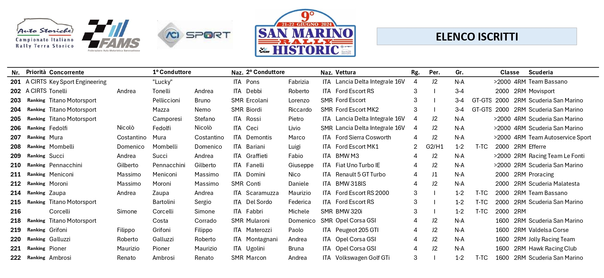 Cliccando a questo link o sull’immagine sotto l’elenco iscritti del 9° San Marino Rally Historic: