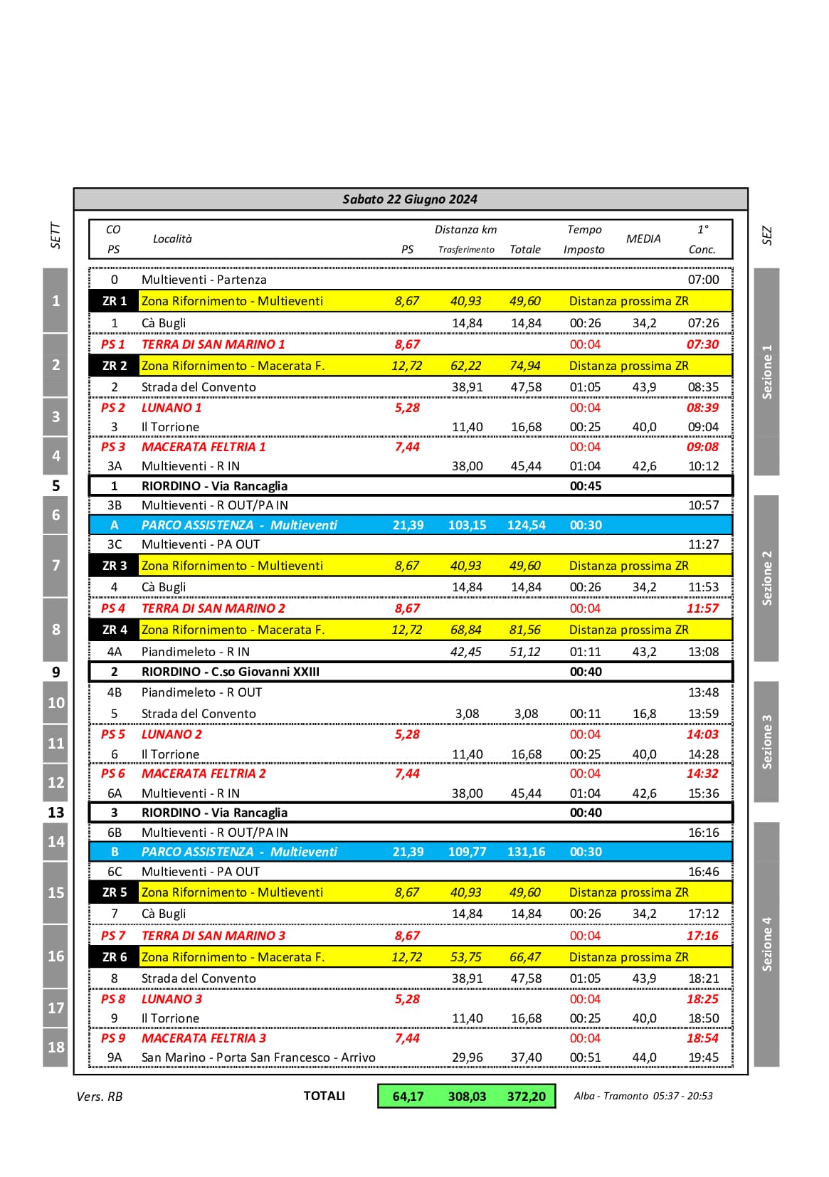 I motori si accenderanno tra poche ore, a partire dalle ore 7.00 per la partenza dalla zona Multieventi, per poi vedere gli equipaggi affrontare le prime tre speciali: “Terra di San Marino 1” di 8,67 Km a partire dalle 7.30, “Lunano 1” di 5,28 Km dalle ore 8.39 e “Macerata Feltria 1” lunga 7,44 Km a partire dalle 9.08. I concorrenti torneranno poi al Multieventi per il riordino ed il primo parco assistenza della gara. Questa la Tabella Tempi e Distanze: