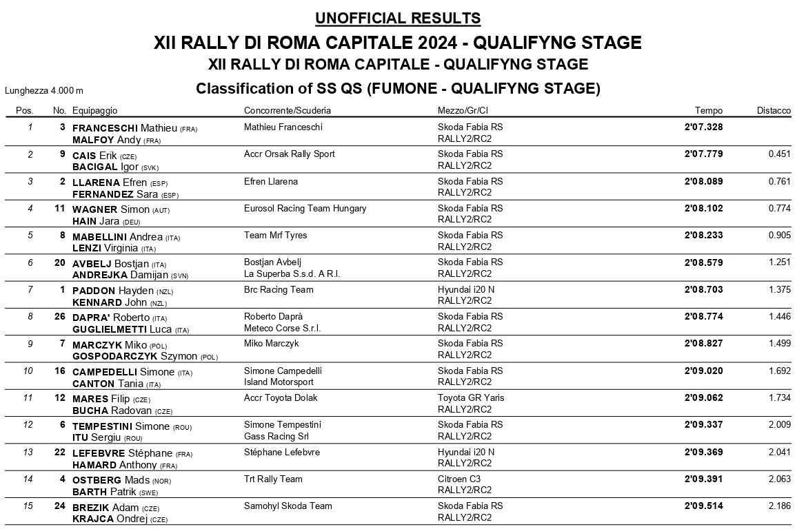 Nella prova di qualifica Mathieu Franceschi, attualmente secondo nella classifica dell’ERC, è riuscito a staccare il miglior tempo. Il francese è poi seguito, nella classifica dei tempi, da altri due protagonisti dell’Europeo, Erik Cais ed Efren Llarena, sulla stessa vettura. Un podio formato da tre esemplari di Skoda Fabia, nella medesima versione, la più evoluta RS Rally2.