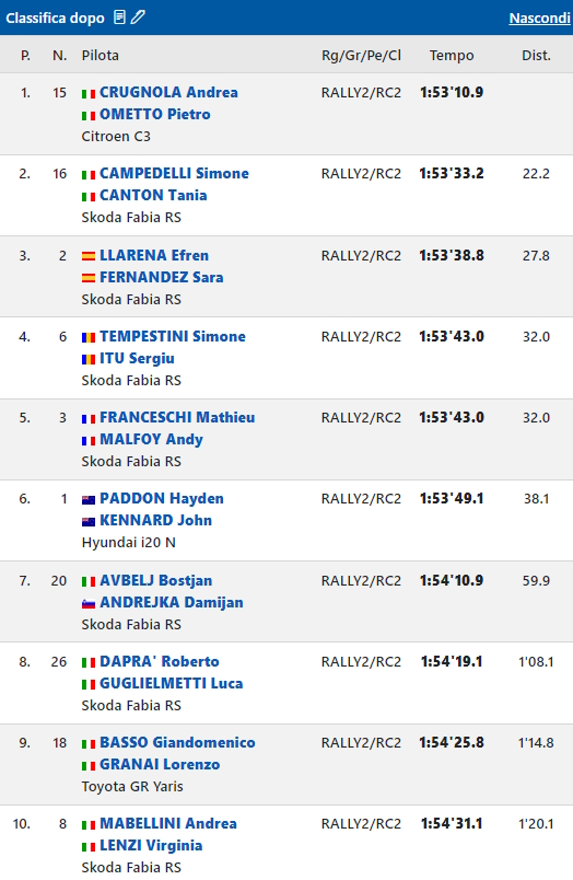 Un rally, ed un weekend, che consegna la vittoria assoluta a Crugnola-Ometto, davanti a Campedelli-Canton di 22.2 secondi e Llarena-Fernandez, sull’ultimo gradino del podio, a 27.8 secondi.