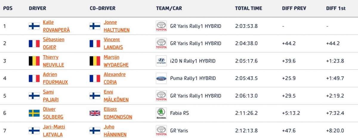 Prima della ripetizione di sua maestĂ Ouninpohja, la classifica diceva che Rovanpera era giĂ in controllo con oltre 39 secondi su Ogier e un minuto e 13 secondi circa su Neuville. In WRC2 nessun problema per Solberg che vince anche la Paijala 2 e porta il vantaggio sul sempre ottimo Latvala a 26,6 secondi.