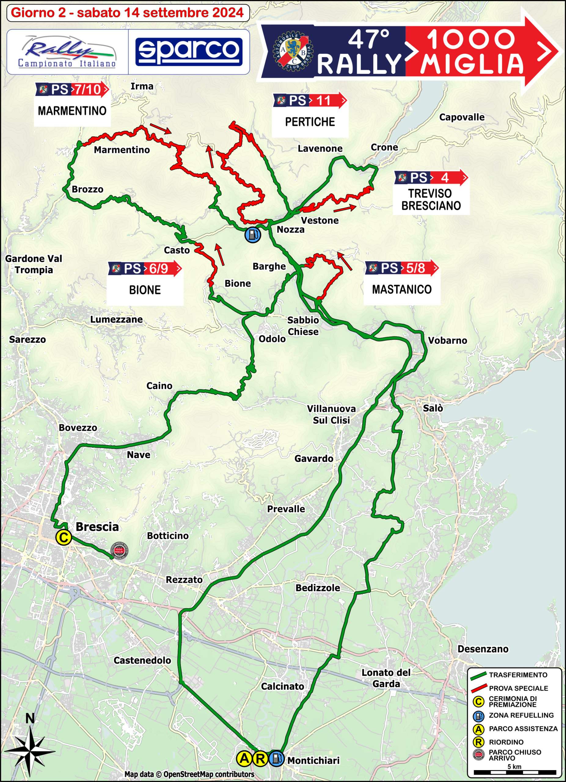 Prima tappa spettacolare con la Power Stage “Valle Sabbia Dall’Era Valerio” identica al 2023: tratto completamente in discesa da Mastanico verso Barghe. La strada, non troppo stretta, e gli spettacolari tornanti sotto il Santuario della Madonna del Ronchino saranno trasmessi in diretta TV sia su ACI Sport TV che su RAI Sport. La giornata proseguirà con il grande ritorno della “Treviso Bresciano”, tratto storico ripreso dagli Anni Novanta. Questa prova parte da Vestone ed offre una combinazione tra gli stretti tornanti iniziali ed un tratto centrale più ampio e pianeggiante prima della discesa verso Idro. Chiusura di giornata con gli oltre 19 chilometri di “Pertiche”, in partenza dalle 20:17. Conosciuta come l’Università del rallysmo bresciano, quest’anno la prova torna al classico con la partenza da Nozza, il pittoresco borgo di Belprato, il bivio di Livemmo in salita, San Rocco in discesa e una inedita parte finale, dopo Forno d’Ono, dove si proseguirà verso Vestone.