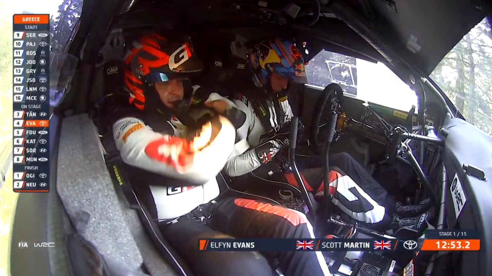 Ai già problemi degli equipaggi di punta della categoria Rally1 si segnalano anche i problemi alla vettura nipponica di classe Rally2 di Jan Solans e gli incidenti di Pierre-Louis Loubet e del pilota locale Lambros Athanassoulas che hanno portato all’esposizione della bandiera rossa e dell’interruzione della prima prova speciale per tutti gli equipaggi che dovevano ancora prendere il via.