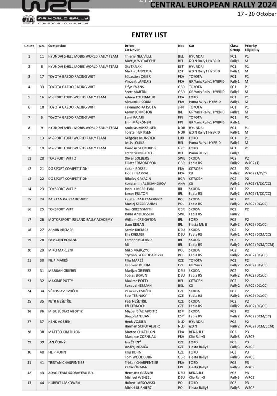 Il penultimo round stagionale, in programma dal 17 al 20 ottobre tra Austria, Germania e Repubblica Ceca, vedrà al via 10 Rally1 e 44 partenti totali