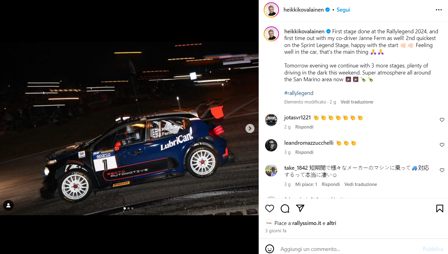“Prima tappa conclusa al Rallylegend 2024, e prima uscita anche con il mio copilota Janne Ferm! 2° più veloce nella Sprint Legend Stage, soddisfatto della partenza. Mi sento bene in macchina, questa è la cosa principale. Domani (venerdì) sera continuiamo con altre 3 prove, ci sarà tanto da guidare al buio questo weekend. C’è una super atmosfera in tutta la zona di San Marino”