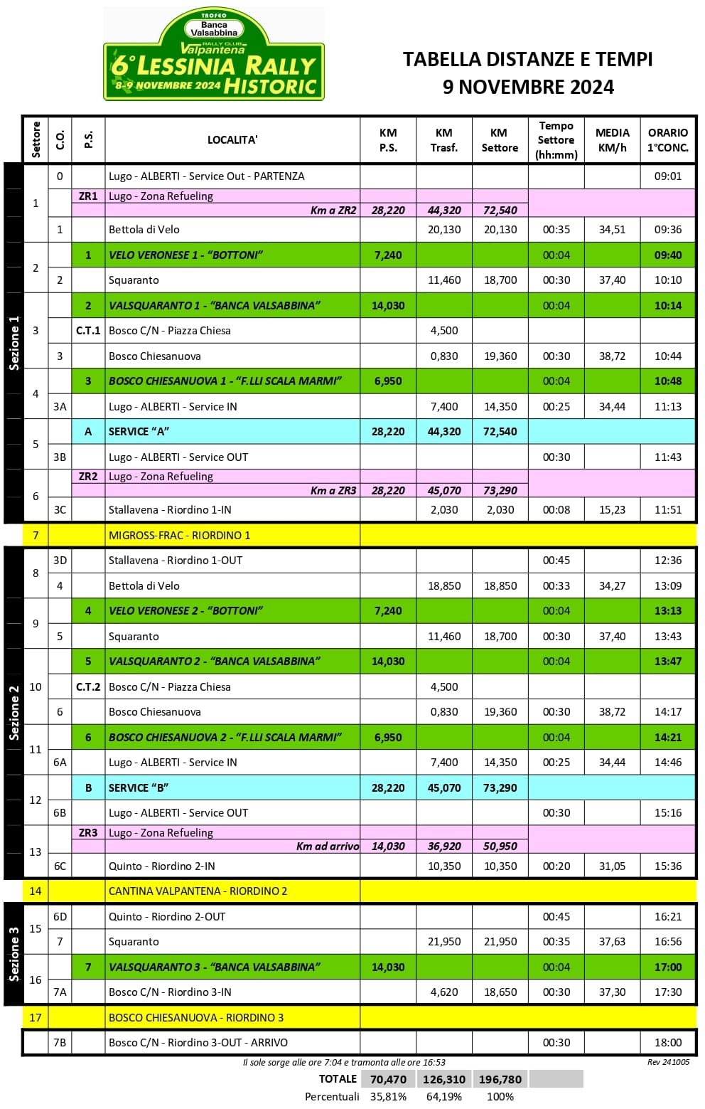 Il rally si correrà su 7 prove speciali, tutte al sabato, per un totale di oltre 70 chilometri cronometrati. La prova più lunga sarà la “Valsquaranto” di oltre 14 chilometri, ripetuta tre volte, mentre la più corta, poco sotto i 7 chilometri, sarà la “Bosco Chiesanuova”. L’arrivo, a Bosco Chiesanuova, è previsto dalle ore 18.
