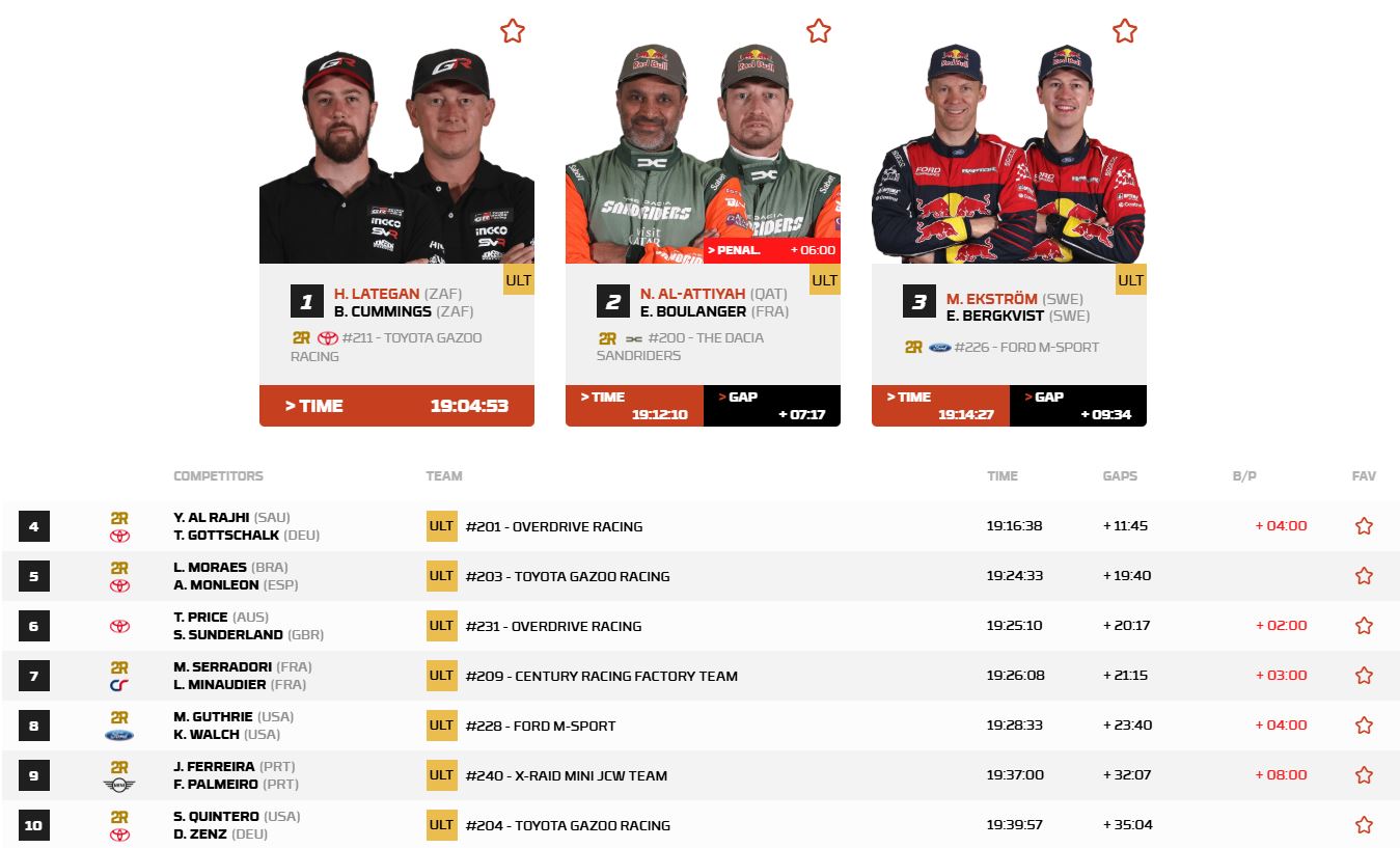 La tappa di oggi è stata vinta dal sudafricano Saood Variawa (Toyota Gazoo Racing), che ha chiuso gli ultimi intertempi in modo impeccabile, riuscendo a raggiungere e superare i suoi rivali negli ultimi chilometri. Secondo posto per il francese Guerlain Chicherit (X-Raid Mini JCW Team), grazie a un’incredibile rimonta nella seconda metà della tappa. In terza posizione troviamo l’americano Seth Quintero (Toyota Gazoo Racing), che è riuscito ad imporsi su De Mevius (X-Raid Mini JCW Team) grazie a una penalità inflitta al pilota belga. Quinta posizione per il portoghese Joao Ferreira (X-Raid Mini JCW Team). Solo sesto il qatariota Nasser Al-Attiyah (Dacia Sandriders), che negli ultimi intertempi ha recuperato posizioni sullo svedese Mattias Ekström (Ford M-Sport), che per la prima metà della gara aveva comandato la classifica. Chiudono la top 10: Serradori (Century Racing), Moraes (Toyota Gazoo Racing) e De Villiers (Toyota Gazoo Racing). Il leader della classifica generale, Henk Lategan (Toyota Gazoo Racing), ha chiuso in undicesima posizione.