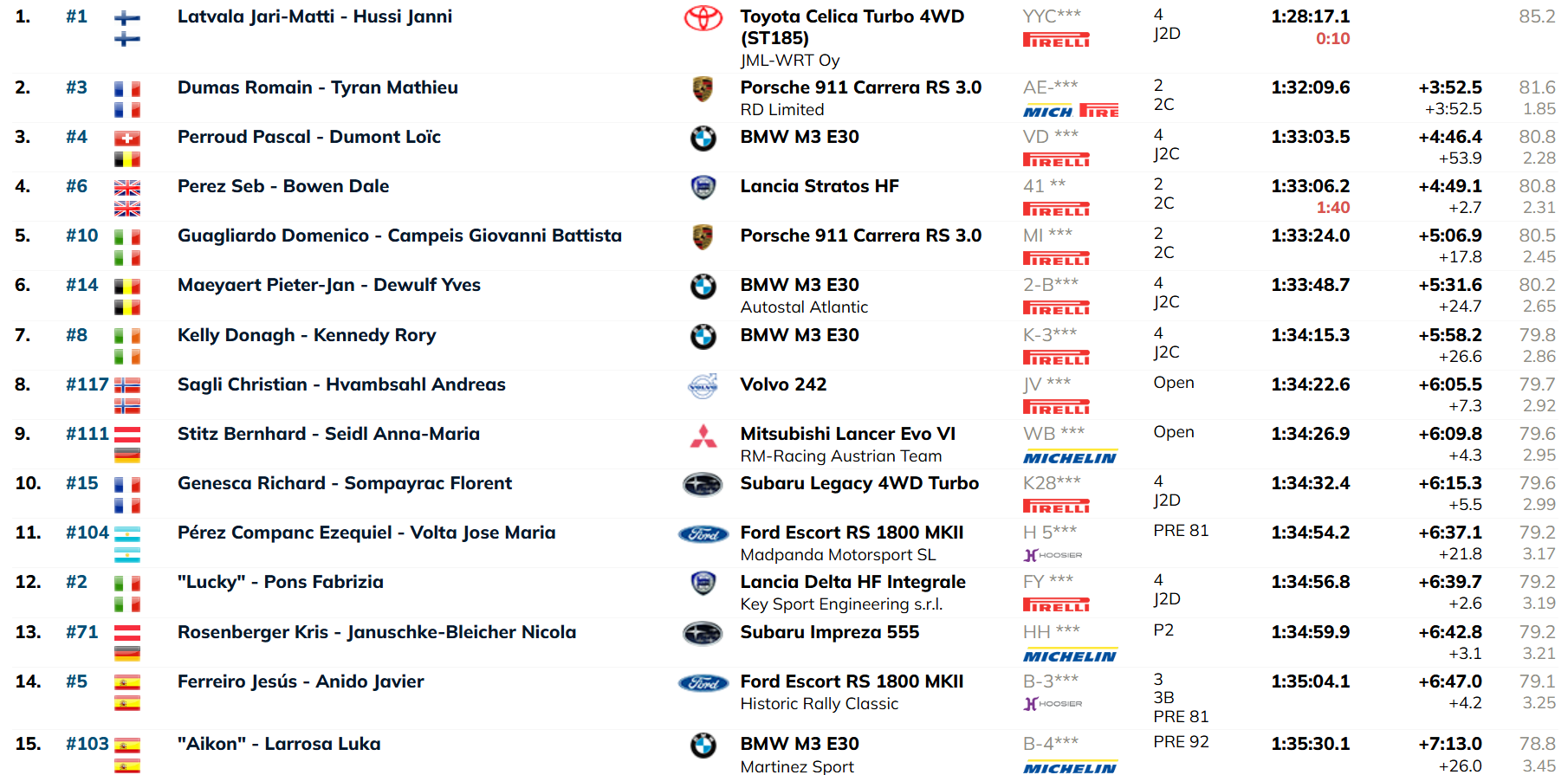 Un dominio incontrastato che ha costretto Romain Dumas e la propria Porsche 911 Carrera RS 3.0 a dover lottare per ambire al massimo alla seconda posizione assoluta, conquistata con un vantaggio di 54 secondi su Pascal Perroud, terzo al traguardo con la propria BMW M3 E30.