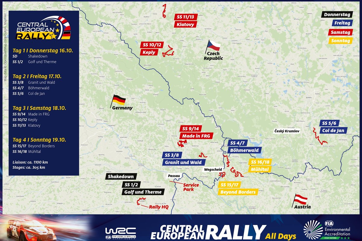 Il programma scatterà venerdì con una giornata destinata a entrare nella storia: per la prima volta, una tappa del WRC attraverserà Germania, Austria e Repubblica Ceca nello stesso giorno. Le speciali “Granit und Wald” (GER), “Böhmerwald” (AUT) e “Col de Jan” (CZE) offriranno un mix di scenari mozzafiato e sfide tecniche. Quest’ultima, situata a nord-est di Kaplice, sarà affrontata due volte, rendendola una delle prove chiave del weekend.
