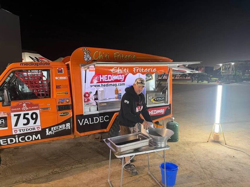 Ma il vero colpo di scena arriva una volta terminata la speciale. Al calare della sera, il Toyota Land Cruiser del team Ch’ti Friterie cambia completamente ruolo: da veicolo da rally diventa un food truck itinerante, completo di cucina portatile, dove Diers prepara e serve patatine fritte per ricaricare le energie nel bivacco.