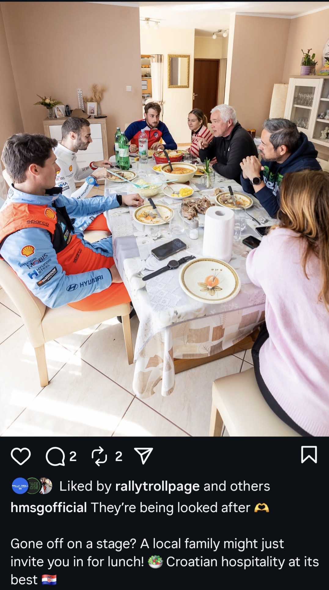 A margine dell’incidente in curioso episodio ha coinvolto l’equipaggio Hyundai Motorsport: un famiglia ha avuto il piacere di invitarvi a pranzo. Una tipica consolazione a base di specialità croate.